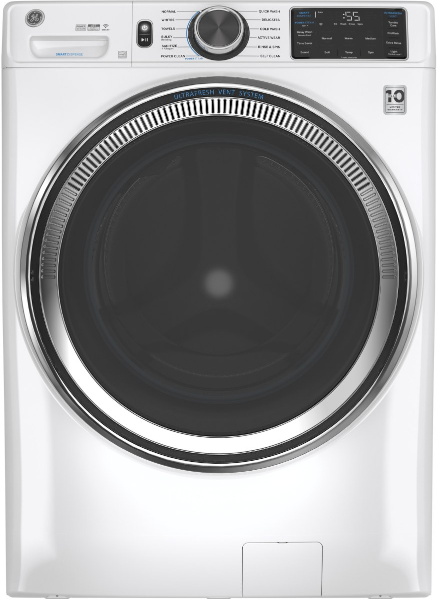 Sanitize soiled linens or towels in this front-load GE washer. A capacity of 4.8 cu. ft. lets you clean a few days' worth of clothing in one load. Personalize each wash cycle with the digital controls on this GE washer. The GE® 4.8 Cu. Ft. Satin Nickel Smart Front Load Washer features UltraFresh Vent System With OdorBlock™, Microban® antimicrobial technology and SmartDispense™ Technology.Read More